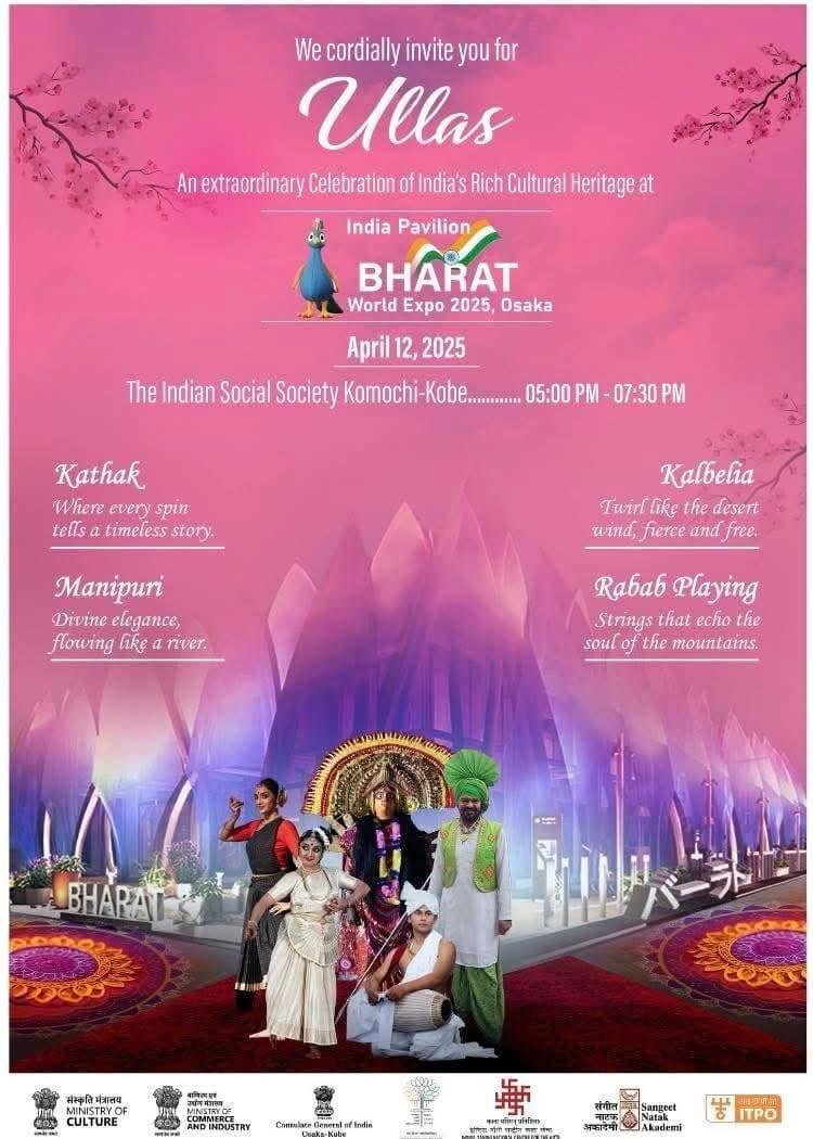 The Indian Social Society invites you to a spectacular Ullas Event: a cultural evening in Osaka! Prepare to be mesmerized by the artistry of Kathak, where intricate footwork and expressive gestures weave captivating narratives. Experience the serene beauty of Manipuri, a classical dance form known for its fluid grace. Feel the pulse of Rajasthan with the dynamic and vibrant Kalbelia dance. And let the enchanting sounds of the Rabab, a traditional instrument, transport you to another world. Join us from 5:00 PM to 7:30 PM for an unforgettable celebration of Indian culture.